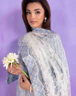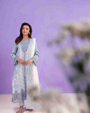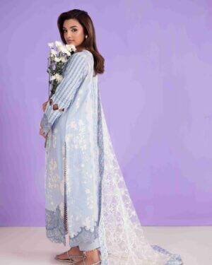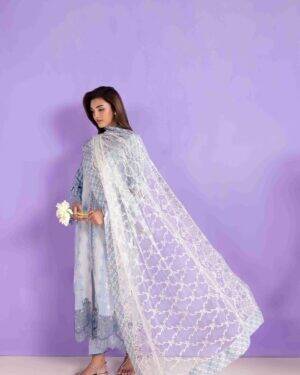 A serene shade of periwinkle blue sets the tone for this effortlessly elegant look. Crafted from dobby lawn, the shirt is adorned with intricate embroidery that adds texture and depth. Paired with a classic cotton trouser and a beautifully embroidered net dupatta, this ensemble brings a soft, feminine charm to your wardrobe.