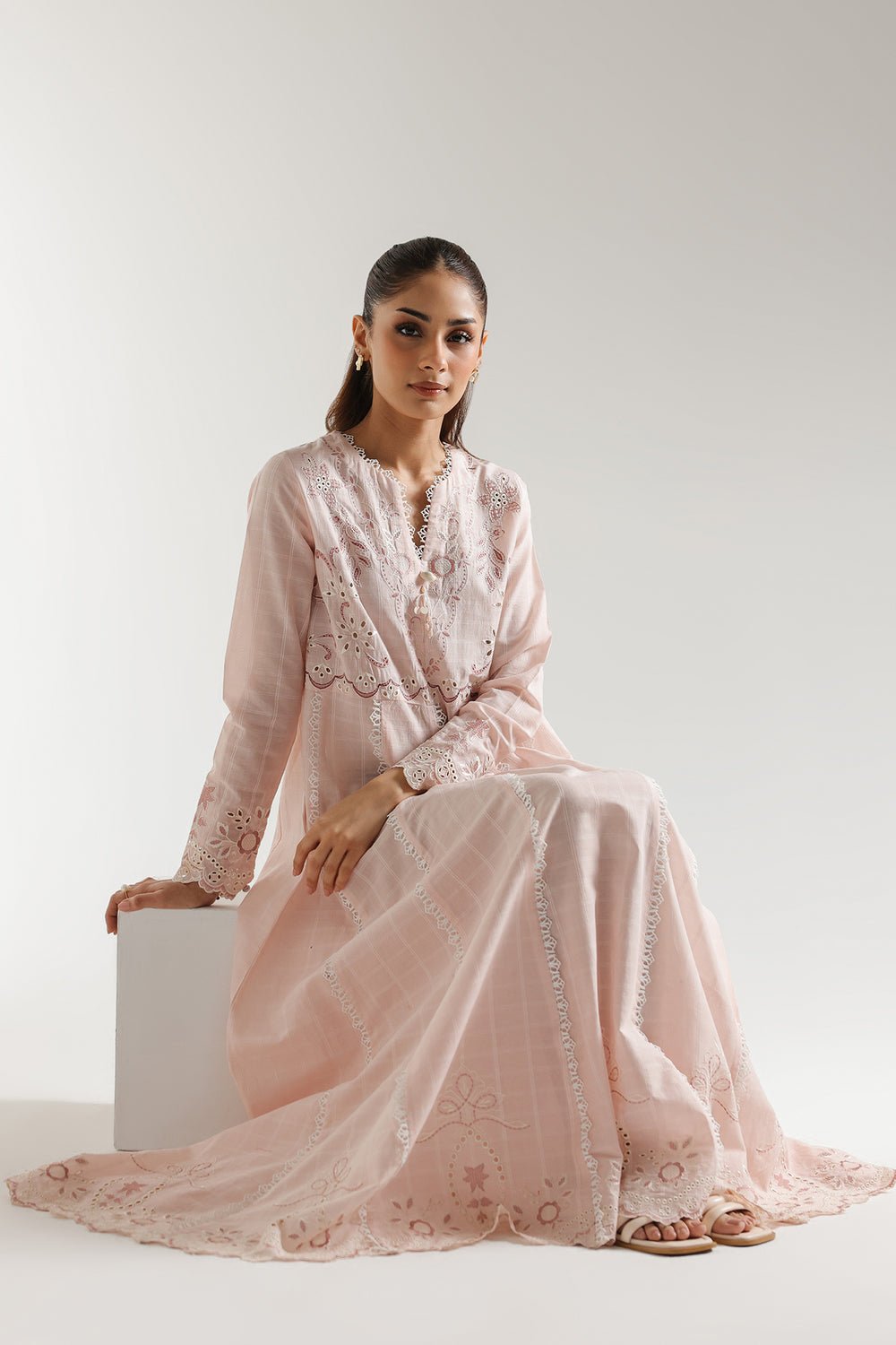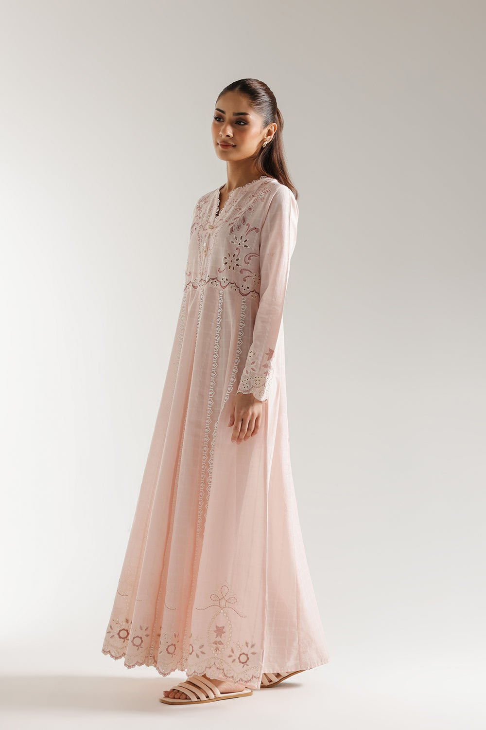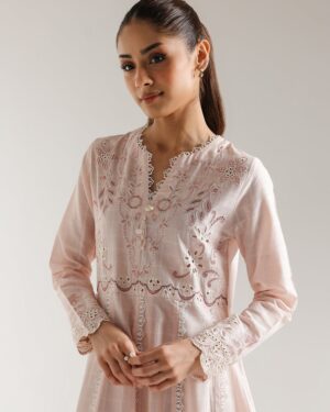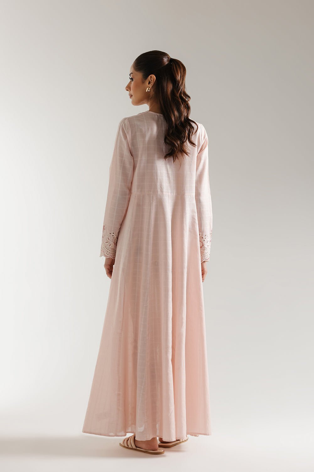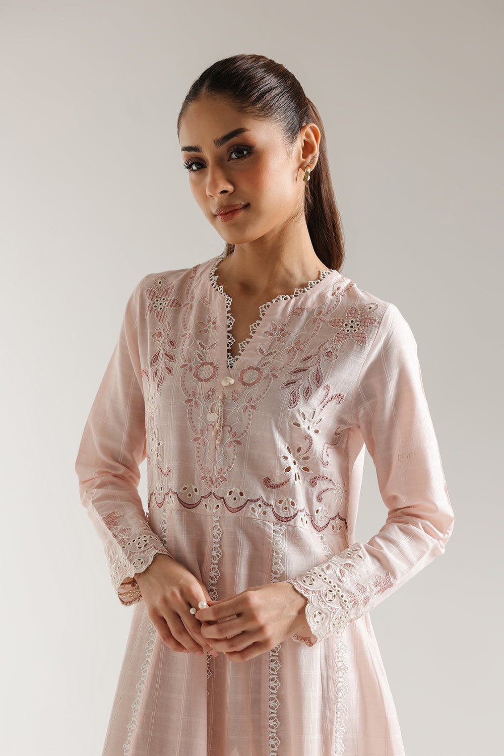 SHIRT – A LINE FIT – ROUND NECK WITH V SLIT – FULL SLEEVES – FLARED HEM – LONG LENGTH.