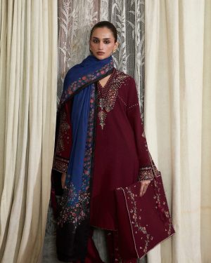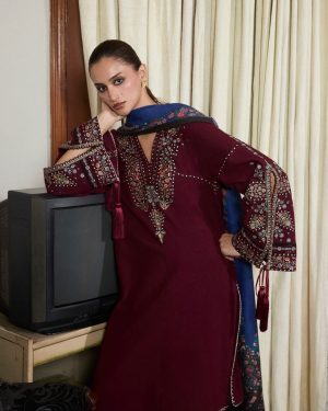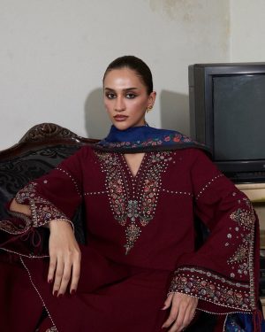 Description: The ensemble features a maroon shirt adorned with intricate multicolor floral embroidery, exuding a timeless elegance. The sleeves mirror the floral motifs, creating harmony and refinement, while matching maroon shalwar continues the embroidered pattern, completing a cohesive look. The outfit is elegantly finished with a poly wool printed shawl, adding texture and a graceful traditional charm to the entire ensemble.