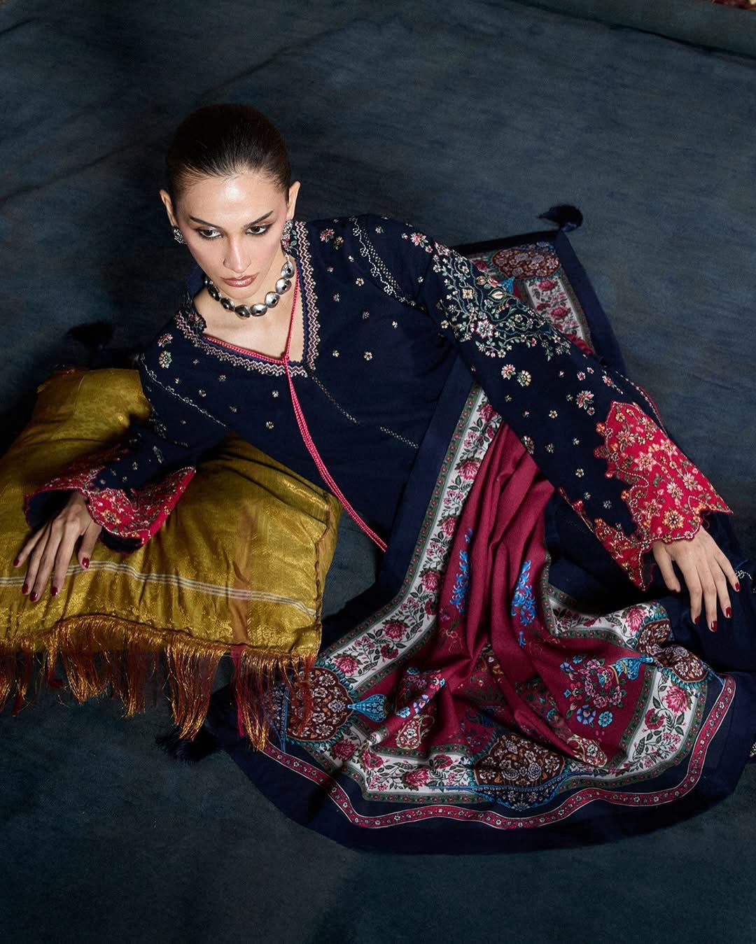 Description: The outfit features a blue shirt adorned with intricate multicolored traditional embroidery, while the sleeves are accented with vibrant red embroidered patches, adding a striking contrast. Matching blue trousers carry the same embroidery and red patch details, creating a harmonious and refined look. The ensemble is completed with a poly wool printed shawl, lending texture and a graceful, traditional finish.