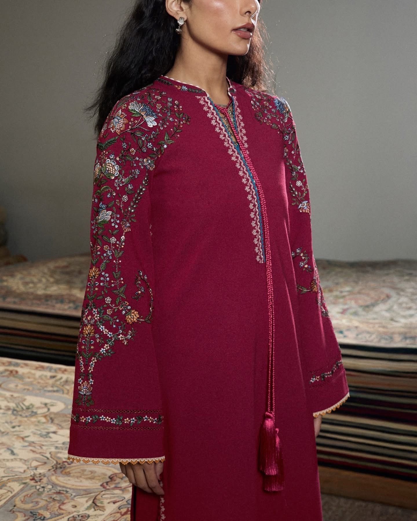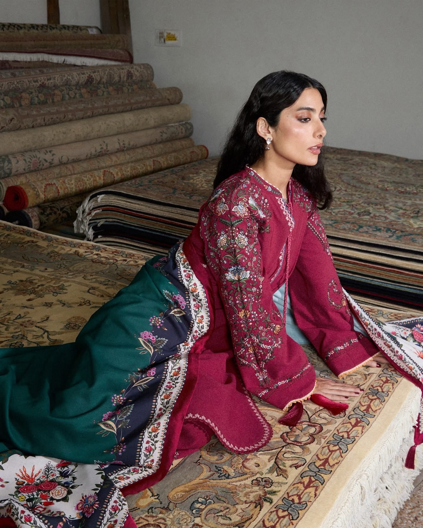 Description: The outfit features a carrot-red shirt adorned with intricate multicolor floral embroidery, radiating traditional elegance. The sleeves echo the same floral motifs, creating a harmonious and refined look, while matching carrot-red shalwar carries the embroidery for a cohesive silhouette. A poly wool printed shawl completes the ensemble, adding texture and a graceful, timeless finish to the traditional attire.