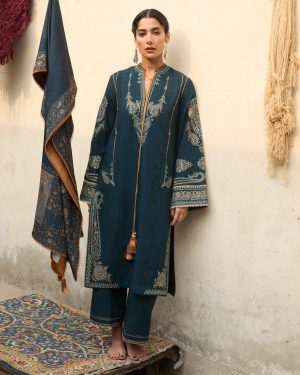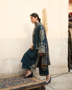 Description: This ensemble features a zinc-colored shirt adorned with intricate monochrome tilla embroidery, showcasing exquisite craftsmanship and timeless elegance. The sleeves mirror the delicate motifs, adding harmony to the design. Complementing the shirt, the zinc-colored trousers showcase the same embroidery, completing a cohesive and sophisticated silhouette. A poly wool printed shawl completes the attire, lending texture, depth, and a refined traditional charm.