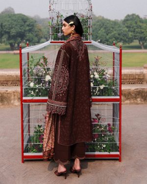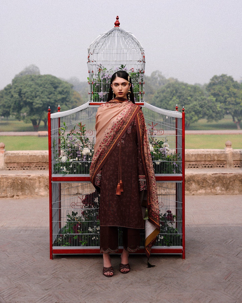 Description: This deep brown traditional attire celebrates the beauty of Kashmiri craftsmanship. It features a beautifully detailed shirt adorned with rich multicolor Kashmiri embroidery, reflecting timeless artistry and cultural elegance. The sleeves and trousers are embellished with matching Kashmiri motifs, creating a harmonious and regal look. A printed wool shawl enhances the ensemble with its soft texture and classic charm, perfect for refined winter styling.