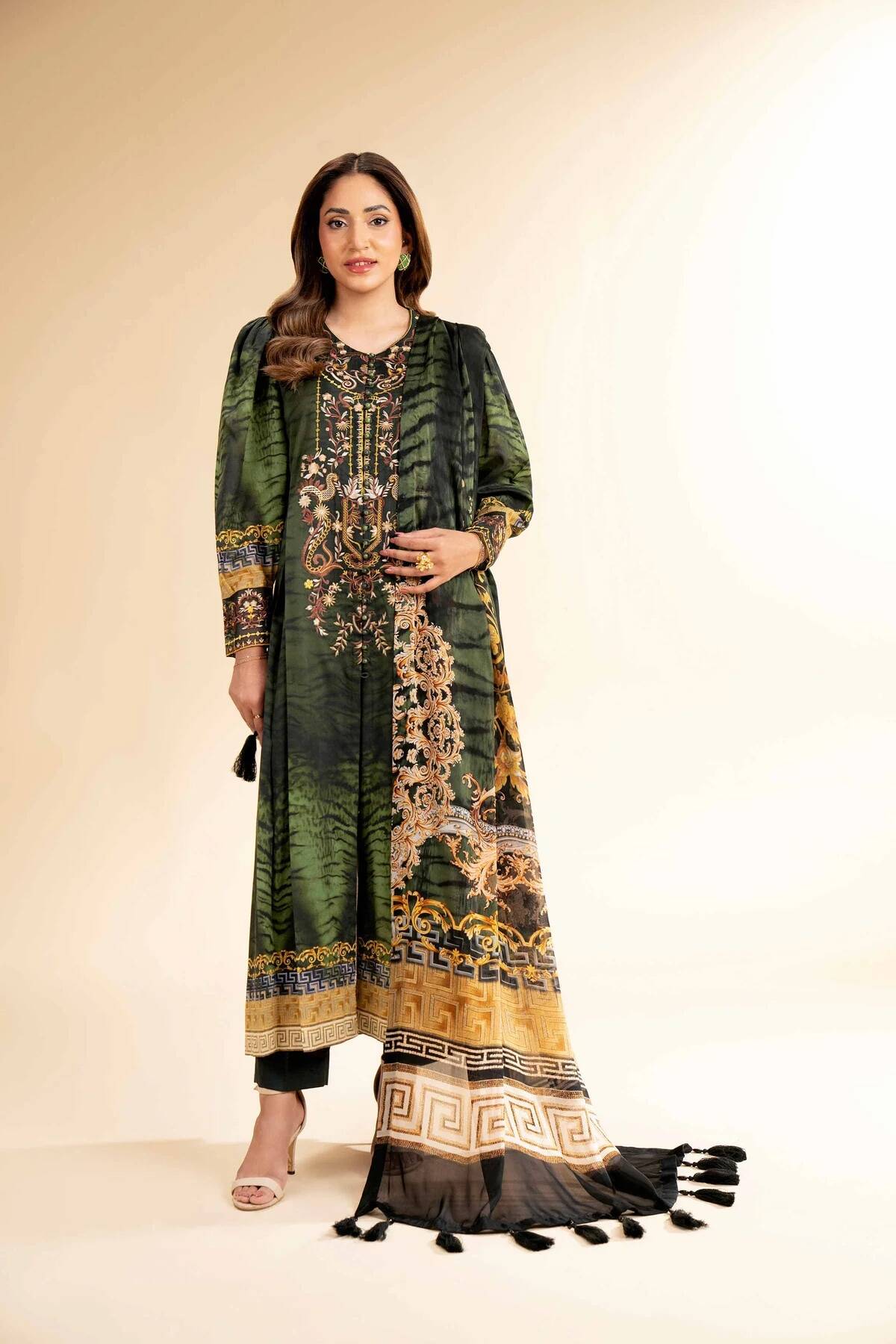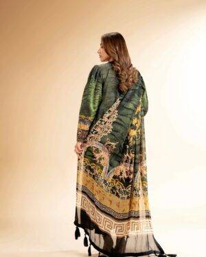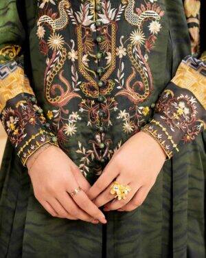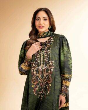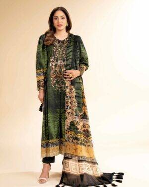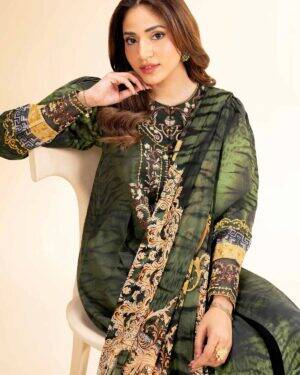 Feel the confidence of flawless style with this digital printed embroidered three-piece creation from the latest unstitched summer collection.