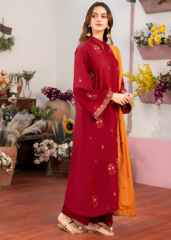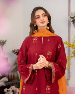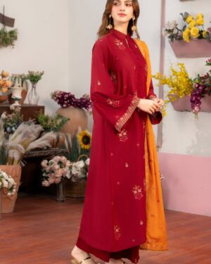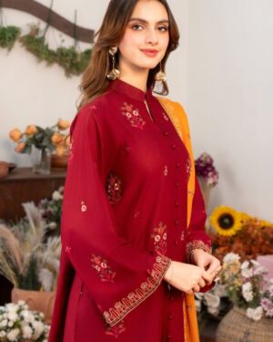 Additional Description: Mehroon Colored Lawn Straight Embroidered Shirt, Embroidered Sleeves with embroidery patch and Ban neck with v cut.
