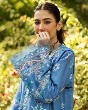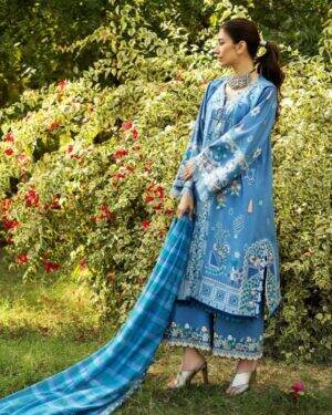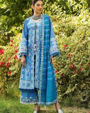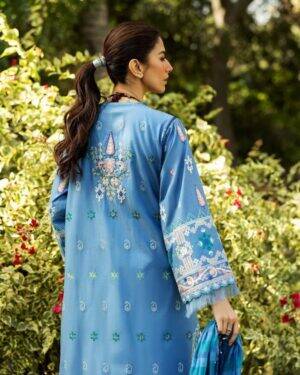 Embroidered lawn Right Front Panel – 1 piece Embroidered lawn Left Front Panel – 1 piece Embroidered lawn side extension panels (L+R) – 1 piece Embroidered lawn shirt corners – 4 piece Embroidered lawn sleeves – 0.72 yard Embroidered back – 1 yard Back motif – 1 piece Yard dyed Dupatta – 2.7 yard Embroidered dupatta border – 8.7 yard Dyed Cambric Trouser – 2.12 yard Embroidered touser border organza – 48″ Dupatta Fabric : Yard Dyed Dupatta