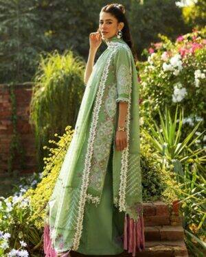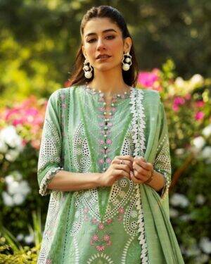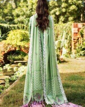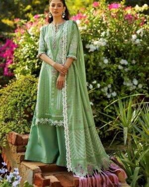 Embroidered lawn Centre Panel – 1 piece Embroidered lawn Side Panels (Right) – 1 piece Embroidered lawn Side Panels (Left) – 1 piece Embroidered lawn Back – 1 yard Embroidered lawn Sleeves – 0.72 yard Embroidered organza shirt border – 2 yard Embroidered organza sleeve border – 45″” Embroidered organza neckline patti – 30″” Embroidered dupatta centre – 1.8 yard Embroidered dupatta palu extension 1 – 0.72 yard Embroidered dupatta palu extension 2 – 0.72 yard Dyed Cambric Trouser – 2.12 yard”