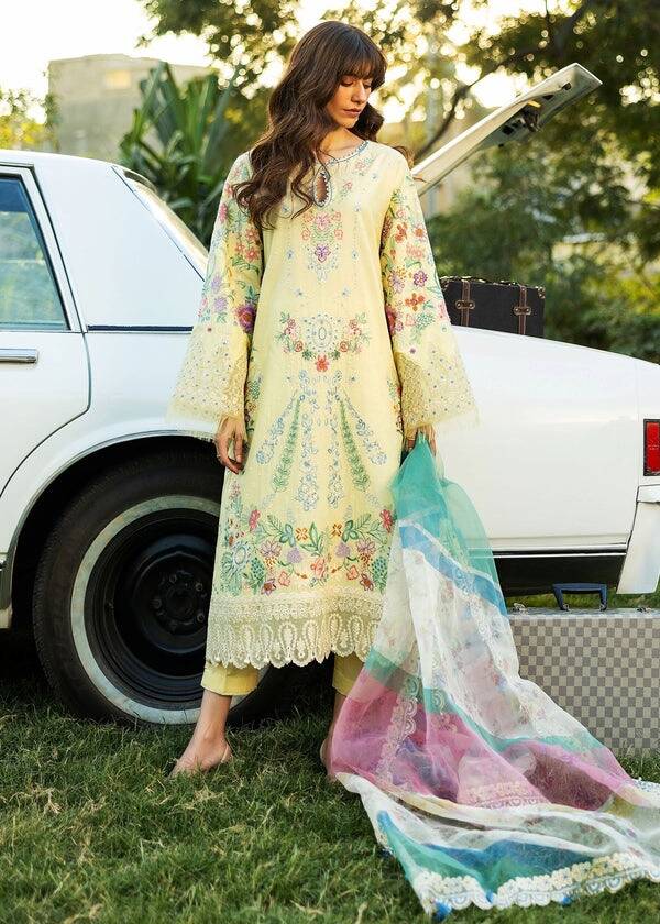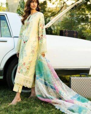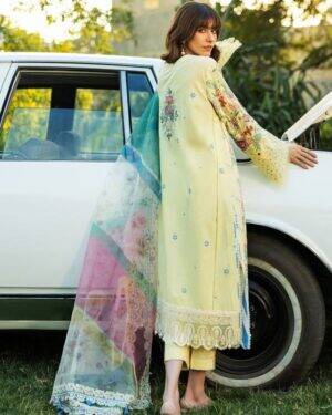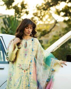 Embroidered lawn Center Panel – 1 piece Embroidered lawn Side Panels – 1 piece Embroidered lawn Back – 1 yard Embroidered lawn Sleeves – 0.72 yard Embroidered organza back patch – 1 piece Embroidered organza sleeve border – 45″” Embroidered organza shirt border – 2 yard Embroidered organza trouser border – 2.16 yard Embroidered organza dupatta border – 8.7 yard Printed organza dupatta – 2.7 yard Dyed Cambric Trouser – 2.16 yard