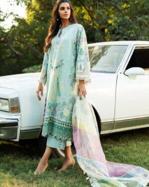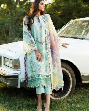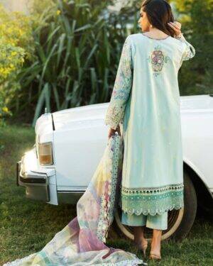 Embroidered lawn Center Panel – 1 piece Embroidered lawn Side Panels – 1 piece Embroidered lawn Back – 1 yard Embroidered lawn Sleeves – 0.72 yard Embroidered organza back patch – 1 piece Embroidered organza sleeve border – 45″” Embroidered organza shirt border – 2 yard Embroidered organza trouser border – 2.16 yard Embroidered organza dupatta border – 8.7 yard Printed organza dupatta – 2.7 yard Dyed Cambric Trouser – 2.16 yard