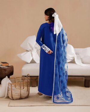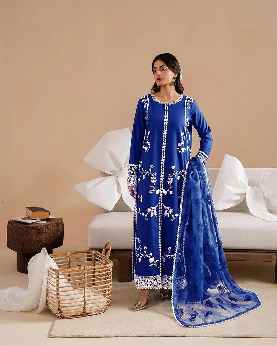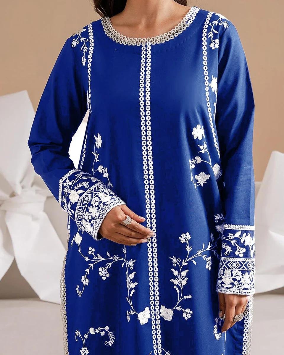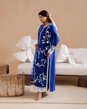 Gracefully designed panelled shirt cut from the finest quality Pima lawn in the shades of Royal Blue. Embellishments feature monochrome inspired intricate embroidery details all over the shirt.